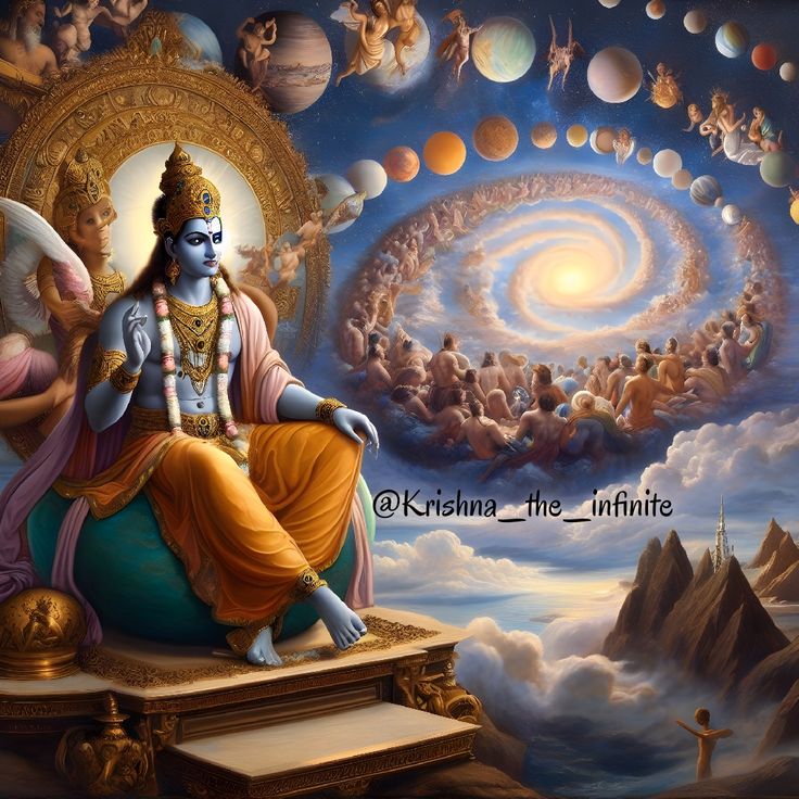 Par Lui , ce monde qui est un simple mirage, prend apparence tangible, même pour les grands sages et les deva. Par Lui, les univers matériels, produits illusoires des trois gunas, semblent l’image même de la réalité. Sur Lui donc je médite, sur Lui qui est la Vérité Absolue, vivant éternellement en Son Royaume spirituel, à jamais libre de l’illusion.