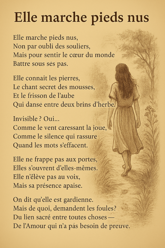Elle marche pieds nus, Non par oubli des souliers, Mais pour sentir le cœur du monde Battre sous ses pas.