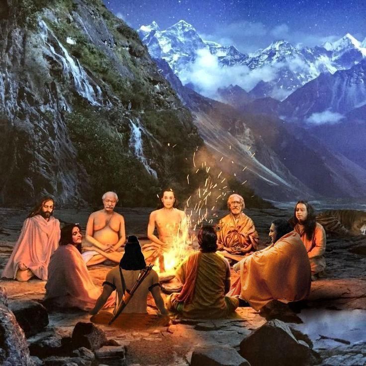 Parmi les êtres se trouvant sur cette image : nous voyons : Mahavatar Babaji et en allant vers la droite dans le sens des aiguilles d’une montre : Sri Yukteswar Giri Sri Paramahamsa Yogananda Sri Paramahamsa Vishwananda Sri Krishna Sri Ram Mère Divine Anandamoyi Ma Christ Jésus Sri Lahiri Mahasaya.