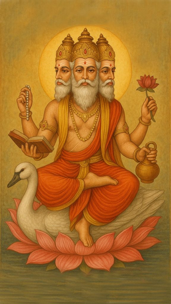 8. Brahma = Brahma est décrit comme le dieu créateur qui a émergé des eaux cosmiques au début des temps. Selon divers textes, il est né d’un œuf d’or (Hiranyagarbha) ou du nombril de Vishnu. Brahma est souvent associée au Satarudriya, un hymne du Yajurveda, qui met en évidence ses qualités divines et son rôle cosmique. Brahma est généralement représentée avec quatre visages, chacun représentant une direction, et symbolisant la nature globale de sa sagesse et de sa connaissance. Il est vénéré comme source de toute connaissance et est souvent considéré comme le créateur des Védas, les textes sacrés de l’hindouisme. Son rôle de Dieu créateur souligne l’importance de comprendre les origines de la vie et de l’univers. 9. Bhuta = éléments subtils au plus grossier. Les cinq bhūta sont