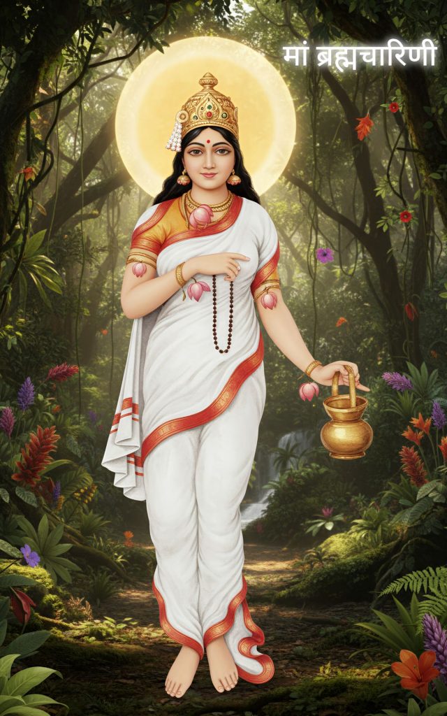 2. Brahmacharini : Dans le deuxième avatar, tenant un chapelet dans sa main droite et un Kamandala (pot d’eau) dans sa main gauche, Brahmacharini symbolise Tapasya ou pénitence.