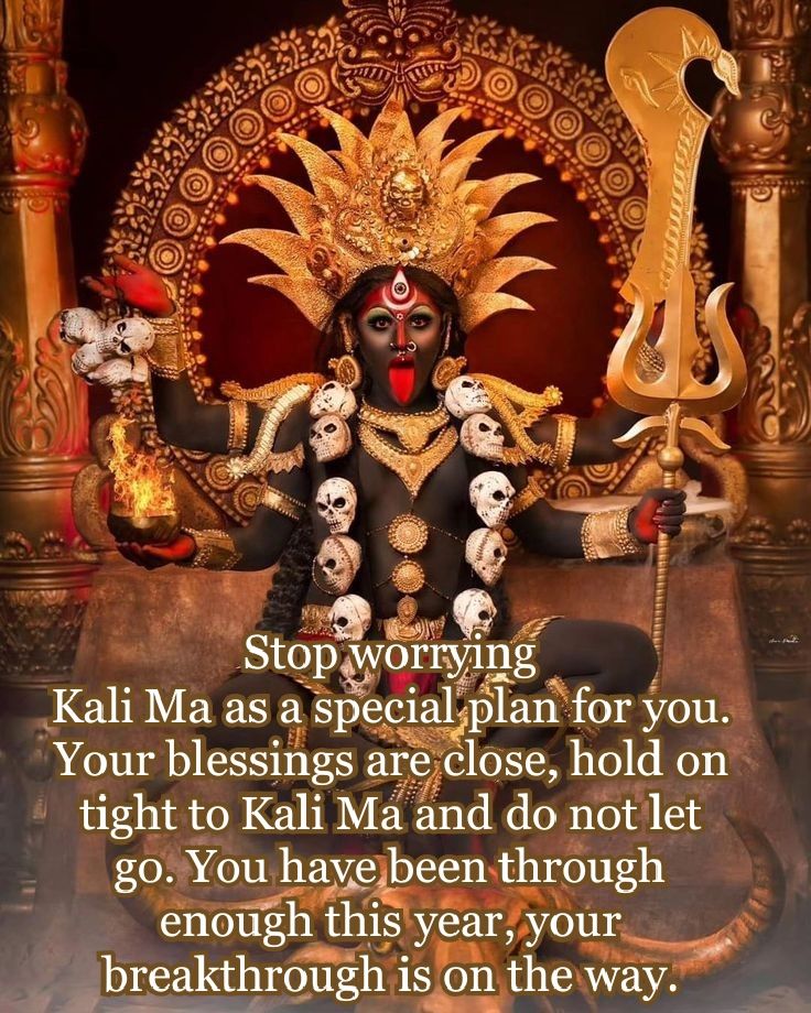 Pour le dévot, elle est vêtue de l’univers, elle est l’image d’une mère protectrice, et les crânes de son collier représentent les 51 lettres du sanskrit.