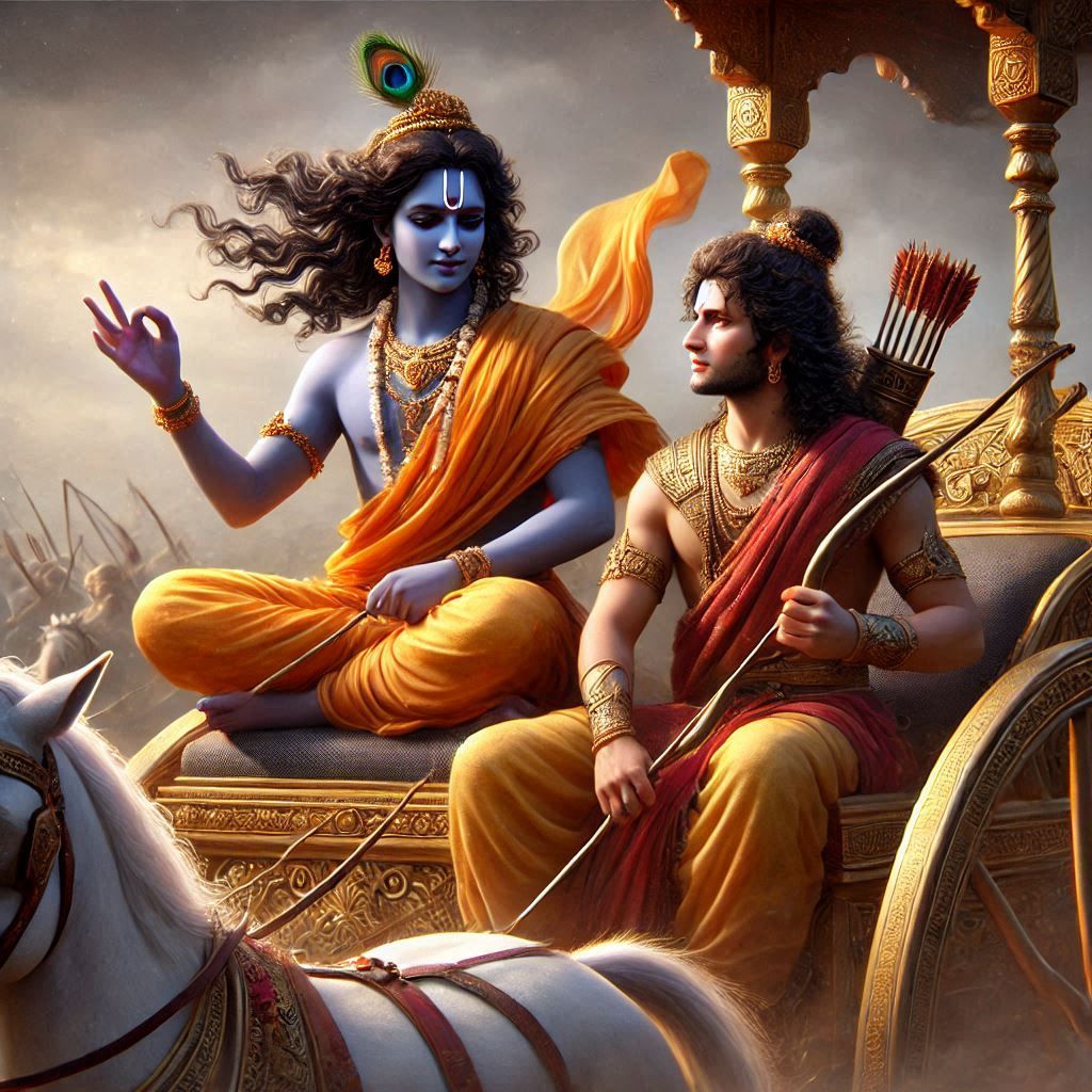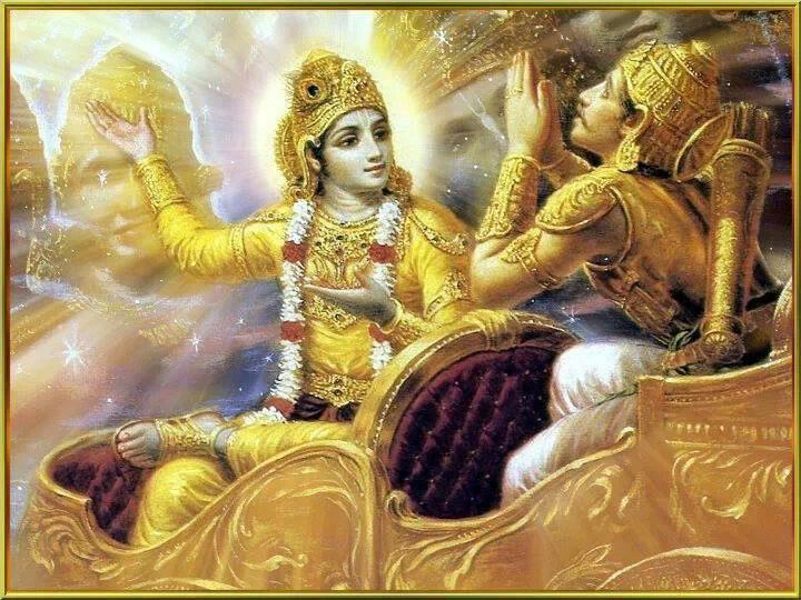 « Sur ces mots en pleine bataille,Arjuna laissa tomber arc et flèches, et s’affaisa au fond de son char, l’esprit ravagé par le chagrin ».